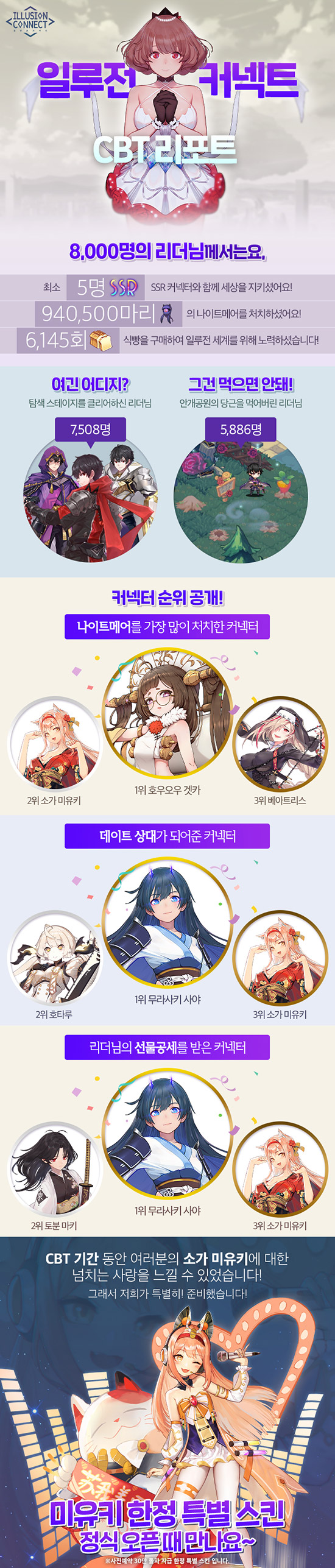 8õ ¸íÀÇ Å×½ºÅ͵é Âü°¡ÇÑ À̹ø CBT´Â Âü°¡ÀÚµéÀÌ ÀüÅõ ÀüÀå¿¡¼ ¾à 100¸¸ ¸¶¸®ÀÇ ³ªÀÌÆ®¸Þ¾î¸¦ óġÇß°í, 6145ȸ ¾ÆÀÌÅÛÀ» ±¸¸ÅÇÏ¿© ÀüÅõ¸¦ Áñ±â´Â µî Å×½ºÆ® ¼¹öÀÓ¿¡µµ Á¤½Ä ¼¹ö¸¦ ¹æºÒÄÉ ÇÒ ¸¸Å ¿Á¤ÀûÀ¸·Î °ÔÀÓÀ» Ç÷¹ÀÌÇÏ¿´À¸¸ç, 'ÀÏ·çÀü Ä¿³ØÆ®'´Â Å×½ºÅ͵éÀÇ 1ÁÖÀϰ£ÀÇ Ç÷¹ÀÌ ±â·ÏÀ» ÀÎÆ÷±×·¡ÇÈÀ¸·Î Á¦ÀÛÇØ¼ ±ÝÀÏ °ø°³Çß´Ù.