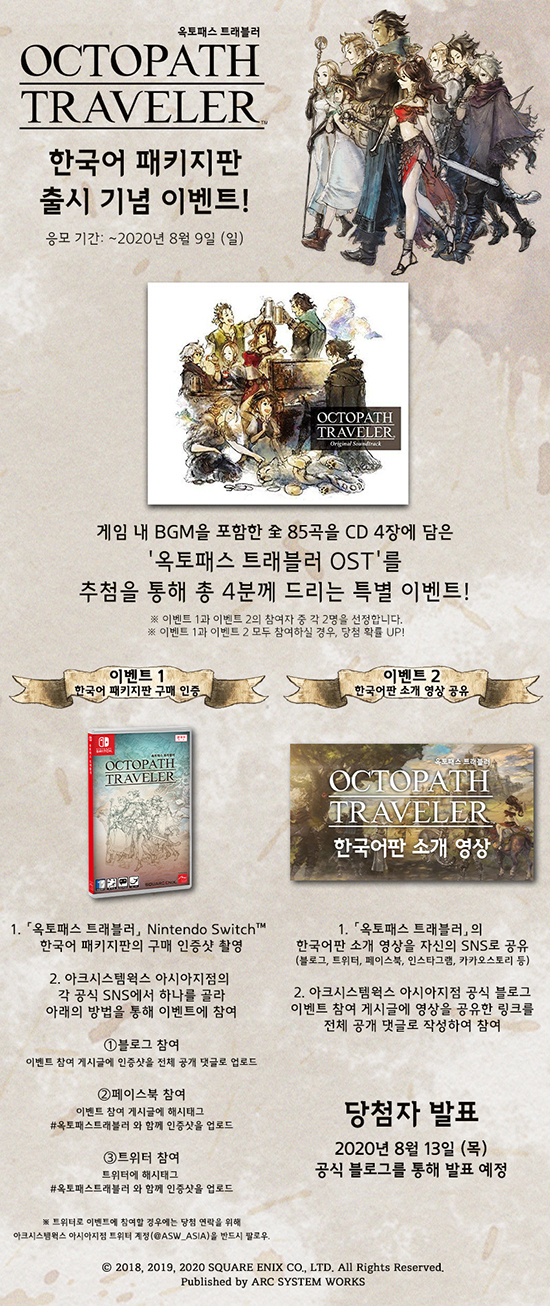 ¾ÆÅ©½Ã½ºÅÛ¿÷½º ¾Æ½Ã¾ÆÁöÁ¡Àº ¡¸¿ÁÅäÆÐ½º Æ®·¡ºí·¯¡¹ Çѱ¹¾î ÆÐŰÁöÆÇÀÇ Ãâ½Ã¸¦ ±â³äÇÏ¿© Çѱ¹¾î ÆÐŰÁöÆÇÀÇ ±¸¸Å ÀÎÁõ¼¦À» °øÀ¯Çϰųª Çѱ¹¾îÆÇ ¼Ò°³ ¿µ»óÀ» ÀÚ½ÅÀÇ SNS¿¡ °øÀ¯Çϸé, ±¹³»¿¡¼ ÇöÀç ¾ÖÇà ¹ÂÁ÷(Apple Music)À» ÅëÇØ ¸¸³ªº¼ ¼ö ÀÖ´Â ¿ÁÅäÆÐ½º Æ®·¡ºí·¯ÀÇ OST, ¡®OCTOPATH TRAVELER Original Soundtrack¡¯À» Ãß÷À» ÅëÇØ ÁõÁ¤ÇÏ´Â À̺¥Æ®¸¦ ¿À´ÃºÎÅÍ ½Ç½ÃÇÑ´Ù. À̺¥Æ®¿¡ ´ëÇÑ ÀÚ¼¼ÇÑ ³»¿ëÀº ´ÙÀ½°ú °°´Ù.