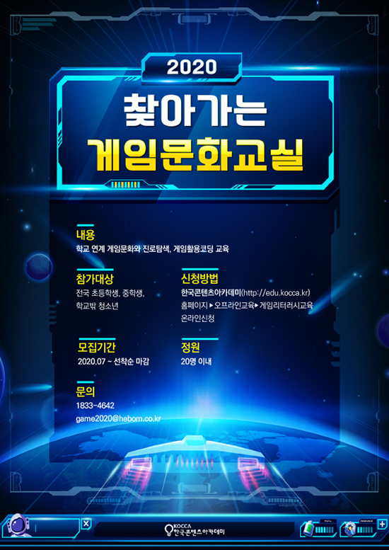 ÄÜÁø¿øÀº '2020 ã¾Æ°¡´Â °ÔÀÓ¹®È±³½Ç'ÀÇ Âü°¡ ½ÅûÀ» 07¿ù 27ÀϺÎÅÍ ½ÅûÀ» ¹Þ´Â´Ù°í ¹àÇû´Ù. Âü¿©¸¦ ¿øÇÏ´Â Çб³´Â Çѱ¹ÄÜÅÙÃ÷¾ÆÄ«µ¥¹Ì(https://edu.kocca.kr)»çÀÌÆ®ÀÇ (¿ÀÇÁ¶óÀα³À° -> °ÔÀÓ¸®ÅÍ·¯½Ã±³À°) Ç׸ñ¿¡¼ ½ÅûÇÒ ¼ö ÀÖÀ¸¸ç, ¼±Âø¼øÀ¸·Î ½ÅûÀÌ ¸¶¹«¸®µÈ´Ù°í ¹àÇû´Ù.