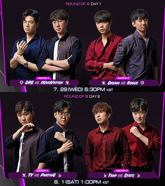 8° 1ÀÏÂ÷ °æ±â´Â 29ÀÏ(¼ö) ¿ÀÈÄ 6½Ã 30ºÐºÎÅÍ ¿¸°´Ù. 1ÀÏÂ÷ 1°æ±â¿¡¼´Â ¹Ú¼öÈ£(DRG)¿Í À̽ÅÇü(INnoVation)ÀÌ ´ë°áÇϰí, 2°æ±â¿¡¼´Â Á¶ÁßÇõ(Dream)°ú À̺´·Ä(Rogue)ÀÌ ¸ÂºÙ´Â´Ù. µÎ °æ±â ¸ðµÎ Àú±× ´ë Å×¶õÀüÀ¸·Î, Áö³ ½ÃÁð1¿¡¼± 4°¿¡ ÁøÃâÇÏÁö ¸øÇÑ Àú±×ÀÇ ¸ð½ÀÀ» À̹ø ½ÃÁð2 4°¿¡¼± º¼ ¼ö ÀÖÀ»Áö ±â´ë¸¦ ¸ðÀ¸°í ÀÖ´Ù. ¶ÇÇÑ, ±º´ë¸¦ ´Ù³à¿Â ¡®±ºÇÊ¡¯ ÇÁ·Î°ÔÀÌ¸Ó ¹Ú¼öÈ£¿Í Á¶ÁßÇõ, µÎ ¼±¼öÀÇ 4° ÁøÃâ ¿©ºÎµµ ¶Ç ´Ù¸¥ °üÀü Æ÷ÀÎÆ®·Î ²ÅÈù´Ù.