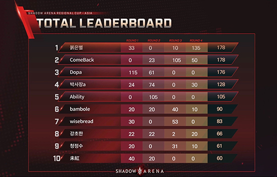 ´ëȸ ¿ì½ÂÀÚ ¡®ºÓÀºº°¡¯Àº 8¿ù 1ÀÏ(Åä) ÁøÇàµÈ °á¼± ¸¶Áö¸· °æ±â¼ Ȱ¾àÇÏ¸ç ¿ªÀü ¿ì½ÂÀ» °Å¸ÓÁã¾ú´Ù. ¡®ºÓÀºº°¡¯Àº 3¶ó¿îµå±îÁö 10À§±Ç¹Û¿¡ ¸Ó¹°·¶Áö¸¸, 4¶ó¿îµå¼ °ø°ÝÀûÀÎ Ç÷¹ÀÌ·Î ¸¹Àº Á¡¼ö¸¦ µû³» 1À§¿¡ ¿Ã¶ú´Ù. ´ëȸ ¼øÀ§´Â ÃÑ 4¹øÀÇ ¶ó¿îµå¸¦ °ÅÃÄ, ¶ó¿îµåº° ¼øÀ§ ¹× Ç÷¹À̾î ų Á¡¼ö¸¦ ÇÕ»êÇØ °áÁ¤µÆ´Ù.