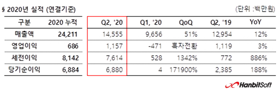 [ÇѺû¼ÒÇÁÆ®] 2020³â 2ºÐ±â ½ÇÀû ¹ßÇ¥ '¸ÅÃâ 146¾ï, ¿µ¾÷ÀÌÀÍ 12¾ï' |