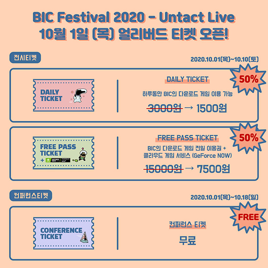 ƼÄϸµÅ©¸¦ ÅëÇØ ¿ÀǵǴ ¡®BIC Æä½ºÆ¼¹ú 2020¡¯ÀÇ ¾ó¸®¹öµå ƼÄÏÀº 10¿ù 1ÀϺÎÅÍ 10¿ù 10ÀϱîÁö´Â ÇÏ·ç µ¿¾È BIC Æä½ºÆ¼¹ú¿¡ Àü½ÃµÈ ´Ù¿î·Îµå °ÔÀÓÀ» ÀÌ¿ëÇÒ ¼ö ÀÖ´Â ¡®µ¥Àϸ® ƼÄÏ¡¯°ú BIC Æä½ºÆ¼¹ú Àü ±â°£ µ¿¾È Àü½ÃµÈ ´Ù¿î·Îµå °ÔÀÓÀ» ÀÌ¿ëÇÒ ¼ö ÀÖÀ¸¸é¼µµ Ŭ¶ó¿ìµå °ÔÀÓ ¼ºñ½ºÀÎ ÁöÆ÷½º³ª¿ì¿¡ Àü½ÃµÈ BIC Àü½ÃÀÛ±îÁö ¸ðµÎ Áñ°Üº¼ ¼ö ÀÖ´Â ¡®ÇÁ¸®ÆÐ½º ƼÄÏ¡¯À» 50% ÇÒÀÎµÈ °¡°ÝÀ¸·Î ÆÇ¸ÅÇÑ´Ù. ÀÏÀϱÇÀÎ ¡®µ¥Àϸ® ƼÄÏ¡¯Àº Á¤°¡ 3,000¿ø¿¡¼ 50% ÇÒÀÎµÈ ±Ý¾×ÀÎ 1,500¿ø¿¡, ÀüÀϱÇÀÎ ¡®ÇÁ¸®ÆÐ½º ƼÄÏ¡¯Àº Á¤°¡ 15,000¿ø¿¡¼ 50% ÇÒÀÎµÈ 7,500¿øÀÌ´Ù.