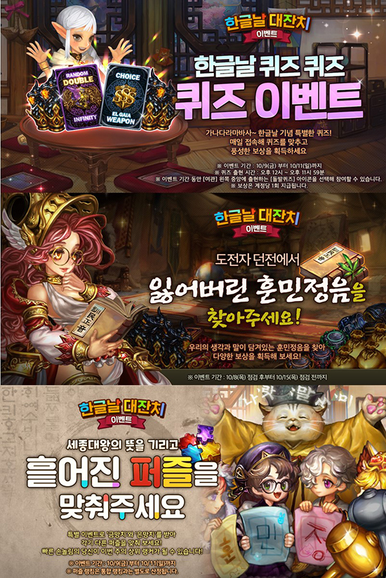 º°À̵Ǿî¶ó!¡¯´Â ¿À´Â 9ÀϺÎÅÍ 11ÀϱîÁö ¸ÅÀÏ Á¢¼ÓÇØ ÄûÁ ¸ÂÃ߸é SSSµî±Þ ¡®¿¤ °¡ÀÌ¾Æ ¹«±â ¼±Åñǡ¯ µî °·ÂÇÑ ¾ÆÀÌÅÛÀ» ¹ÞÀ» ¼ö ÀÖ´Â ¡®Çѱ۳¯ ±â³ä ÄûÁî À̺¥Æ®¡¯¸¦ ÁøÇàÇÑ´Ù. ¶ÇÇÑ ¡®ÆÛÁñÁ¶°¢ ¸ÂÃß±â À̺¥Æ®¡¯µµ ÀÌ ±â°£µ¿¾È ½Ç½ÃÇÑ´Ù. Ưº° À̺¥Æ® ¹Ì¼ÇÀ» ¼öÇàÇÏ¿© ¡®±Ý ¸ÁÄ¡¡¯¿Í ¡®Àº ¸ÁÄ¡¡¯¸¦ ȹµæÇϰí, ÆÛÁñÀ» ¸ÂÃß¸é ±â·ÏÀ» ÅëÇØ »êÁ¤µÈ ·©Å·¿¡ µû¶ó ¡®·çºñ¡¯¿Í ¡®Ä®¶ó¸£ÀÇ È¥¡¯ µî ´Ù¾çÇÑ º¸»óÀ» ¹ÞÀ» ¼ö ÀÖ´Ù.