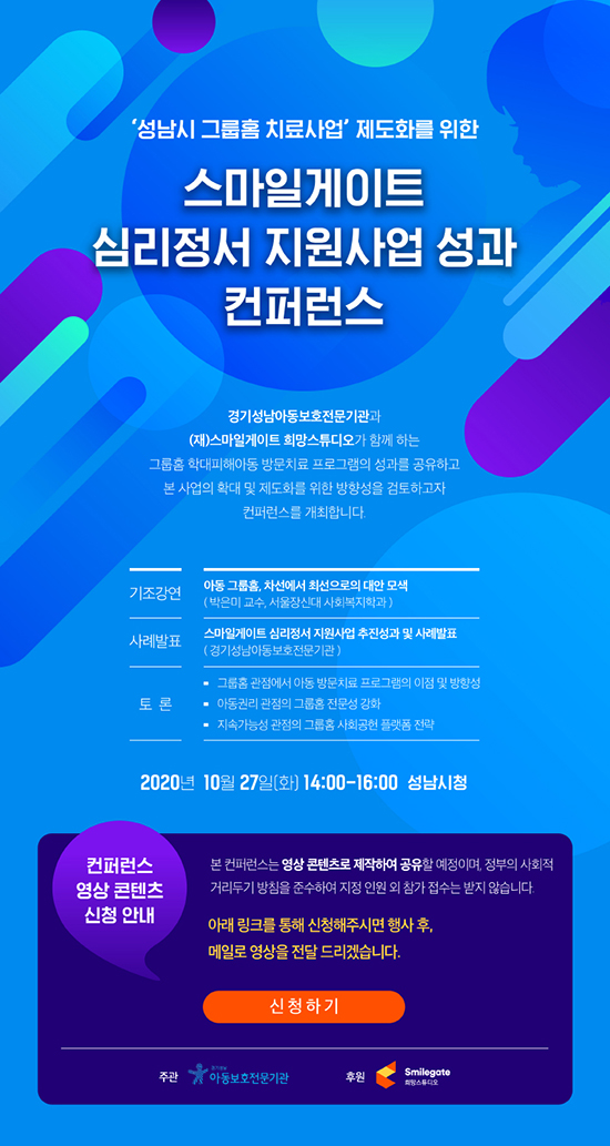 ½º¸¶ÀϰÔÀÌÆ® Èñ¸Á½ºÆ©µð¿À(Èñ¸Á½ºÆ©µð¿À)´Â °æ±â¼º³²¾Æµ¿º¸È£Àü¹®±â°ü°ú ÇÔ²² ¿À´Â 27ÀÏ È­¿äÀÏ ¿ÀÈÄ 2½Ã ¼º³²½Ãû¿¡¼­ ¡®½º¸¶ÀϰÔÀÌÆ® ½É¸®Á¤¼­ Áö¿ø»ç¾÷ ¼º°ú¡¯ ÄÜÆÛ·±½º¸¦ °³ÃÖÇÑ´Ù°í 23(±Ý) ¹àÇû´Ù.