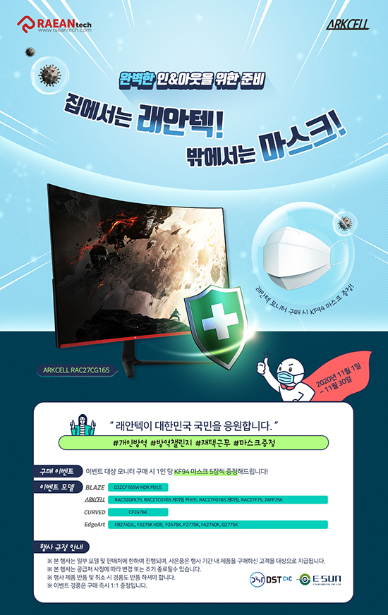 11¿ù 1ÀϺÎÅÍ 11¿ù 30ÀϱîÁö ÁøÇàµÇ´Â À̹ø ÇÁ·Î¸ð¼ÇÀº À̺¥Æ® ¾È³» ÆäÀÌÁö°¡ ¹Ý¿µµÈ ÆÇ¸Å »çÀÌÆ®¿¡ ÇÑÇØ ´ë»ó ¸ð´ÏÅ͸¦ ±¸¸ÅÇϸé ÀÚµ¿À¸·Î Âü¿©°¡ ¿Ï·áµÈ´Ù. Âü¿©ÀÚ Àü¿ø¿¡°Ô´Â KF94 ÀÎÁõ ¸¶½ºÅ©°¡ ´Ù¼¸ À徿 ÁõÁ¤µÈ´Ù.
