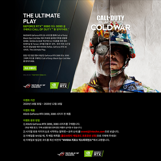¿¡À̼ö½º ÄÚ¸®¾Æ(¿¡À̼ö½º)´Â ¿£ºñµð¾Æ¿Í ÇÔ²² ASUS GeForce RTX 3080, 3090 ½Ã¸®Áî ±×·¡ÇÈÄ«µå ±¸¸ÅÀÚ¸¦ ´ë»óÀ¸·Î ¡®ÄÝ ¿Àºê µàƼ : ºí·¢ ¿É½º ÄÝµå ¿ö(Call of Duty : Black Ops Cold War)¡¯ °ÔÀÓ ÄÚµå ÁõÁ¤ ÇÁ·Î¸ð¼ÇÀ» ÁøÇàÇÑ´Ù.