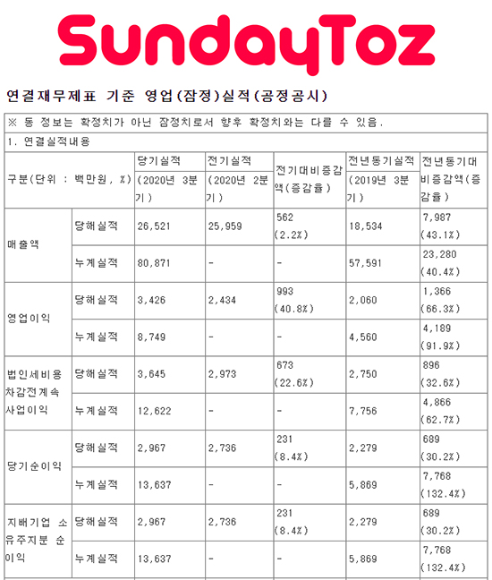 [¼±µ¥ÀÌÅäÁî] 2020³â 3ºÐ±â ½ÇÀû ¹ßÇ¥, ¸ÅÃâ 265¾ï ¿µ¾÷ÀÌÀÍ 34¾ï |
