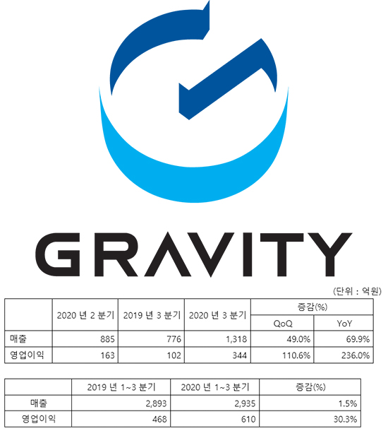 ±×¶óºñƼÀÇ 2020³â 3ºÐ±â ½ÇÀû¿¡ ´ëÇÑ º¸´Ù ÀÚ¼¼ÇÑ ³»¿ëÀº °ø½Ä ȨÆäÀÌÁö(http://www.gravity.co.kr/kr/)¸¦ ÅëÇØ È®ÀÎÇÒ ¼ö ÀÖ´Ù.