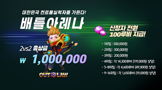 ¹èƲ¾Æ·¹³ª´Â ÁøÁ¤ÇÑ ÄÁÆ®·Ñ ½Ç·ÂÀ» °Ü·ç´Â ¾Æ¿ô·Î ù ¹ø ° °ø½Ä ´ëȸÀÌ´Ù. 1vs1, 2vs2 2°¡Áö ºÎ¹®À¸·Î ³ª´µ¸ç ÃÑ »ó±ÝÀÌ 2¹é¸¸¿øÀ» ³õ°í °æÀïÀ» ÆîÄ£´Ù.