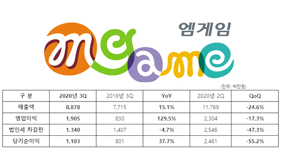 ¿¥°ÔÀÓÀº Áö³ 3ºÐ±â °á»ê °á°ú ¿¬°á ±âÁØ ¸ÅÃâ 89¾ï¿ø, ¿µ¾÷ÀÌÀÍ 19¾ï¿ø, ´ç±â¼øÀÌÀÍ 11¾ï¿øÀ» ±â·ÏÇß´Ù°í 16ÀÏ ¹ßÇ¥Çß´Ù.