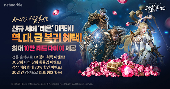³Ý¸¶ºíÀº ¸ð¹ÙÀÏ MMORPG(´ÙÁßÁ¢¼Ó¿ªÇÒ¼öÇà°ÔÀÓ) '¸®´ÏÁö2 ·¹º¼·ç¼Ç'(°³¹ß»ç ³Ý¸¶ºí³×¿À)¿¡ ½Å±Ô ¼¹ö 'Å׿Â'À» ¿À´Ã ¿ÀÈÄ 6½Ã ¿ÀÇÂÇϰí À̸¦ ±â³äÇÑ ÆÄ°ÝÀûÀÎ À̺¥Æ®¸¦ ½Ç½ÃÇÑ´Ù°í 19ÀÏ ¹àÇû´Ù.