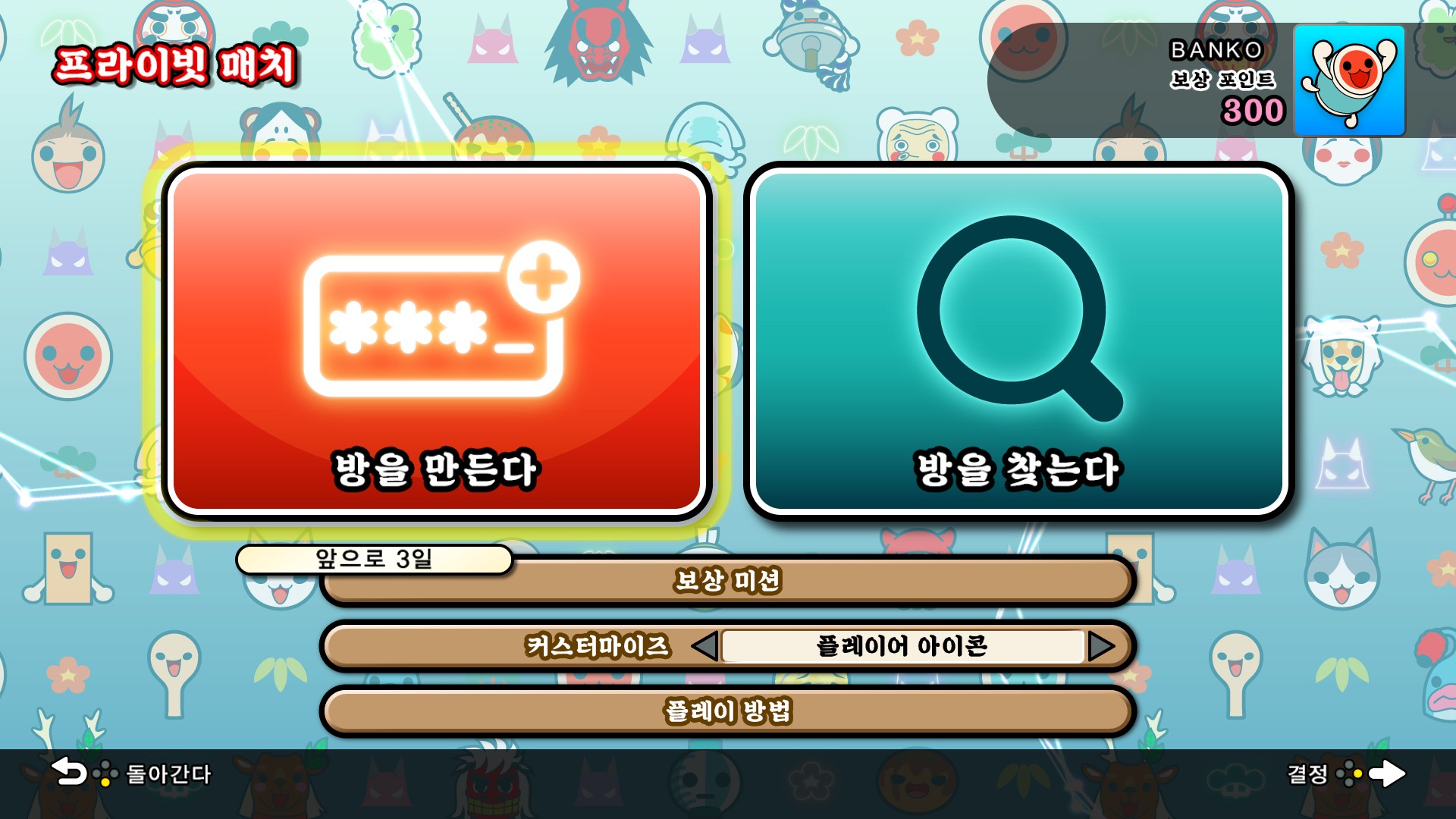 °¢ÀÚÀÇ Áý¿¡¼, ¿Â¶óÀÎÀ¸·Î Ä£±¸¿Í ÇÔ²² ¿¬ÁÖ¸¦ Áñ±âÀÚ! 'ÇÁ¶óÀ̺ø ¸ÅÄ¡'´Â ºñ¹Ð¹øÈ£¸¦ ¼³Á¤ÇØ ¿øÇϴ ģ±¸¿Í ¸ÅĪÇÒ ¼ö ÀÖ´Â »õ·Î¿î ¿Â¶óÀÎ ¸ðµå´Ù. 'ÇÁ¶óÀ̺ø ¸ÅÄ¡'¸¦ ¼±ÅÃÇϰí, ÇÑ ¸íÀÌ '¹æÀ» ¸¸µç´Ù'¿¡¼ 6ÀÚ¸® ºñ¹Ð¹øÈ£¸¦ ¼³Á¤ÇÑ ÈÄ ´ëÀü »ó´ë°¡ '¹æÀ» ã´Â´Ù'¿¡¼ ÇØ´ç ºñ¹Ð¹øÈ£¸¦ ÀÔ·ÂÇÏ¸é ³¡ÀÌ´Ù.