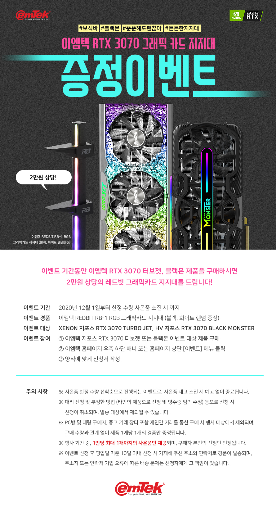 ÀÌ¿¥ÅؾÆÀÌ¿£¾¾(ÀÌ¿¥ÅØ)´Â 12¿ù 01ÀϺÎÅÍ ÀÌ¿¥ÅØ ÁöÆ÷½º RTX 3070 ºí·¢ ¸ó½ºÅÍ ¹× Åͺ¸Á¬ ½Ã¸®Áî Á¦Ç° ±¸¸Å ½Ã 2¸¸ 5õ¿ø »ó´çÀÇ ÀÌ¿¥ÅØ RB1 ±×·¡ÇÈÄ«µå ÁöÁö´ë¸¦ ÁõÁ¤ÇÑ´Ù°í ¹àÇû´Ù.