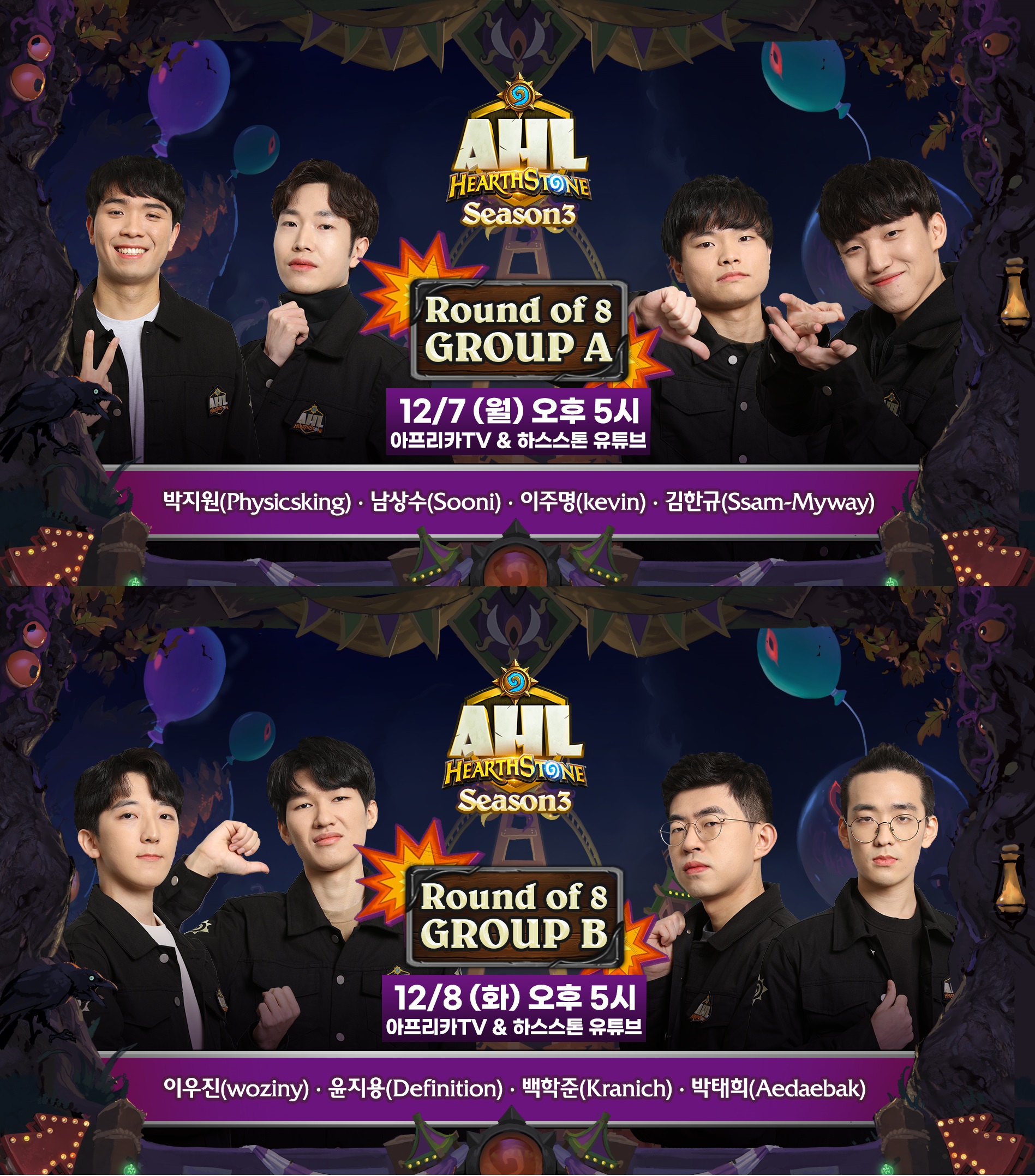 ¾ÆÇÁ¸®Ä«TV´Â 12¿ù 7ÀÏ(¿ù)°ú 8ÀÏ(È) ¾çÀϰ£ ¼¿ï ´ëÄ¡µ¿ ¡®¾ÆÇÁ¸®Ä« ÇÁ¸¯¾÷ ½ºÆ©µð¿À¡¯¿¡¼ ¡®¾ÆÇÁ¸®Ä«TV ÇϽº½ºÅæ ¸®±×(AfreecaTV Hearthstone League, ÀÌÇÏ AHL) ½ÃÁð3¡¯ 8° °æ±â¸¦ ÁøÇàÇÑ´Ù°í ¹àÇû´Ù.