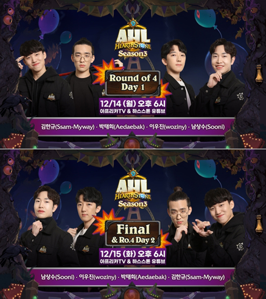 ¾ÆÇÁ¸®Ä«TV´Â 14ÀÏ(¿ù)°ú 15ÀÏ(È) ¾çÀϰ£ ¼¿ï ´ëÄ¡µ¿ ¡®ÇÁ¸¯¾÷ ½ºÆ©µð¿À¡¯¿¡¼ ¡®¾ÆÇÁ¸®Ä«TV ÇϽº½ºÅæ ¸®±×(AfreecaTV Hearthstone League, ÀÌÇÏ AHL) ½ÃÁð3¡¯ 4°°ú °á½ÂÀüÀ» ÁøÇàÇÑ´Ù°í ¹àÇû´Ù. 14ÀÏ(¿ù)¿¡´Â 4° 1°æ±â, 2°æ±â¿Í ½ÂÀÚÀüÀÌ ÁøÇàµÇ¸ç 15ÀÏ(È)¿¡´Â 4° ÆÐÀÚÀü°ú ÃÖÁ¾Àü ±×¸®°í ´ë¸ÁÀÇ ¡®AHL ½ÃÁð3¡¯ °á½ÂÀüÀÌ Ä¡·¯Áø´Ù.