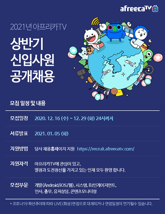 ¾ÆÇÁ¸®Ä«TV´Â 12¿ù 16ÀÏ(¼ö)ºÎÅÍ 29ÀÏ(È)±îÁö ¡®2021³â »ó¹Ý±â ½ÅÀÔ»ç¿ø °ø°³Ã¤¿ë¡¯À» ÁøÇàÇÑ´Ù°í ¹àÇû´Ù. ¾ÆÇÁ¸®Ä«TV´Â À̹ø ä¿ëÀ» ÅëÇØ ¶óÀÌºê ½ºÆ®¸®¹Ö ¼ºñ½º¿¡ ´ëÇÑ ¾ÖÁ¤°ú ³ôÀº ÀÌÇØµµ¸¦ ¹ÙÅÁÀ¸·Î À¯Àú¿ÍÀÇ Á¢Á¡¿¡¼ ÀÏÇÒ ¿ì¼öÇÑ ÀÎÀ縦 ¼±¹ßÇÑ´Ù´Â °èȹÀÌ´Ù.