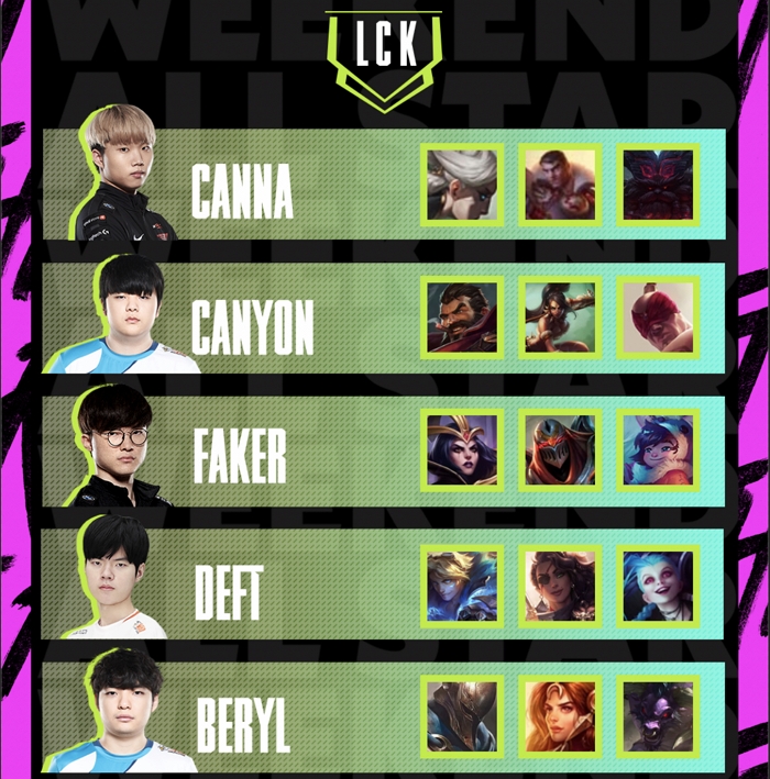 LCK´Â ijª(Ä«¹Ð, Á¦À̽º, ¿À¸¥), ij´Ï¾ð(±×·¹À̺êÁî, ´Ï´Þ¸®, ¸® ½Å), ÆäÀÌÄ¿(¸£ºí¶û, Á¦µå, ´©´©¿Í Àª·³ÇÁ), µ¥ÇÁÆ®(ÀÌÁ¾ó, »ç¹Ì¶ó, ¡ũ½º), º£¸±(ÆÇÅ׿Â, ·¹¿À³ª, ¾Ë¸®½ºÅ¸)°¡ ¼±Á¤µÆÀ¸¸ç, LCK¿Í ¸ÂºÙÀ» LPLÀº 369(À轺, ÇÇ¿À¶ó, ¿À¸¥), Ä«»ç(¸®½Å, ±×·¹À̺êÁî, ¸¶½ºÅÍ ÀÌ), ·çŰ(¸£ºí¶û, ¾ß½º¿À, ½Åµå¶ó), ÀèŰ·¯ºê(µå·¹À̺ì, Ä«ÀÌ»ç, ÀÌÁ¾ó), ¹Ù¿À¶õ(¶óÄ, ³ëÆ¿·¯½º, ¾²·¹½¬)°¡ ¼±ÅõƴÙ.