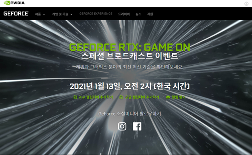 ¿£ºñµð¾Æ´Â ¿À´Â 2021³â 1¿ù 13ÀÏ ¿ÀÀü 2½Ã(Çѱ¹½Ã°£) ½ºÆä¼È À̺¥Æ®ÀÎ ¡®ÁöÆ÷½º RTX: °ÔÀÓ ¿Â(GeForce RTX: Game On)¡¯À» ¿Â¶óÀÎÀ¸·Î »ýÁß°èÇÑ´Ù.