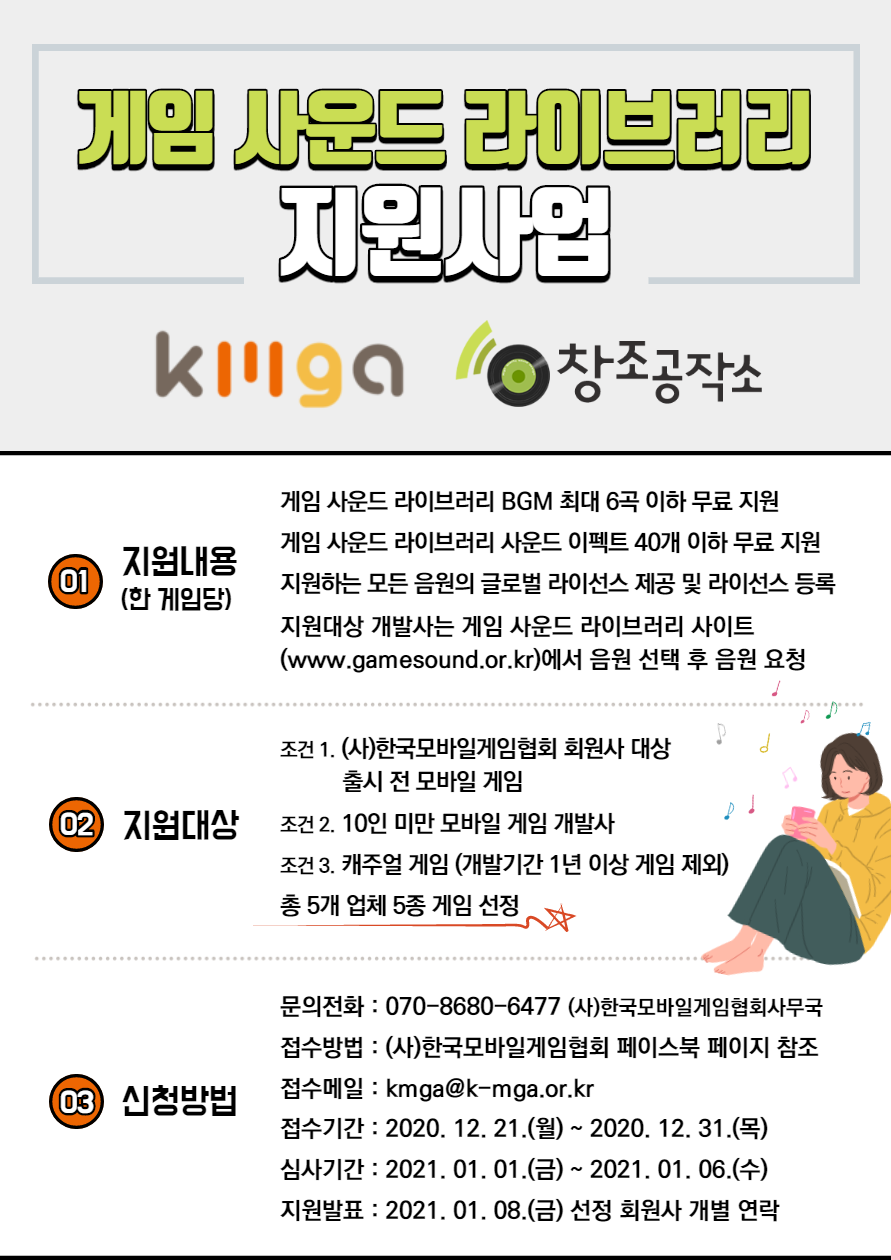 °ÔÀÓ »ç¿îµå·Î °íÃæÀ» °Þ°í ÀÖ´Â Çùȸ ȸ¿ø»ç Áß Àεð°ÔÀÓ °³¹ß»ç¿Í Áß¼Ò °ÔÀÓ°³¹ß»ç°¡ Áö¿ø ´ë»óÀ̸ç, À̹ø Áö¿ø»ç¾÷¿¡´Â 5°³ °³¹ß»ç ÃÑ 5Á¾ÀÇ °ÔÀÓ¿¡ »ç¿îµå ¶óÀ̺귯¸®¸¦ Ȱ¿ëÇÑ °ÔÀÓ À½¾Ç°ú È¿°úÀ½À» Áö¿øÇÒ ¿¹Á¤À̸ç, ÀÌ¿¡ µû¸¥ ±Û·Î¹ú ¶óÀ̼±½º±îÁö Á¦°øÇÑ´Ù. 21ÀϺÎÅÍ 31ÀϱîÁö Çѱ¹¸ð¹ÙÀϰÔÀÓÇùȸ ȸ¿ø»ç¿¡ ÇÑÇØ À̸ÞÀÏÀ» ÅëÇØ Á¢¼ö¸¦ ¹ÞÀ¸¸ç ÀÌÈÄ ½É»ç¸¦ ÅëÇØ ÃÖÁ¾ ¼±¹ßÀÌ ÁøÇàµÈ´Ù.