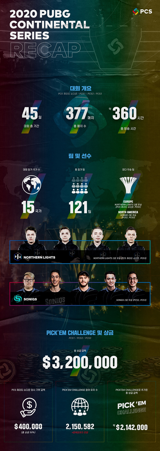 ÃÑ 45ÀÏ µ¿¾È ÆîÃÄÁø PCS ´ëȸ¿¡ Àü ¼¼°è 15°³ Áö¿ª ¹× 121°³ ÆÀÀÌ Âü¿©ÇØ ÃÑ 377¸ÅÄ¡¸¦ ÆîÃÆ´Ù. ÃÖ´Ù ¿ì½ÂÆÀÀÇ ¿µ¿¹´Â À¯·´ NORTHERN LIGHTS(³ë´ø ¶óÀÌÃ÷)¿Í ºÏ¹Ì SONIQS(¼Ò´Ð½º)¿¡ µ¹¾Æ°¬´Ù.