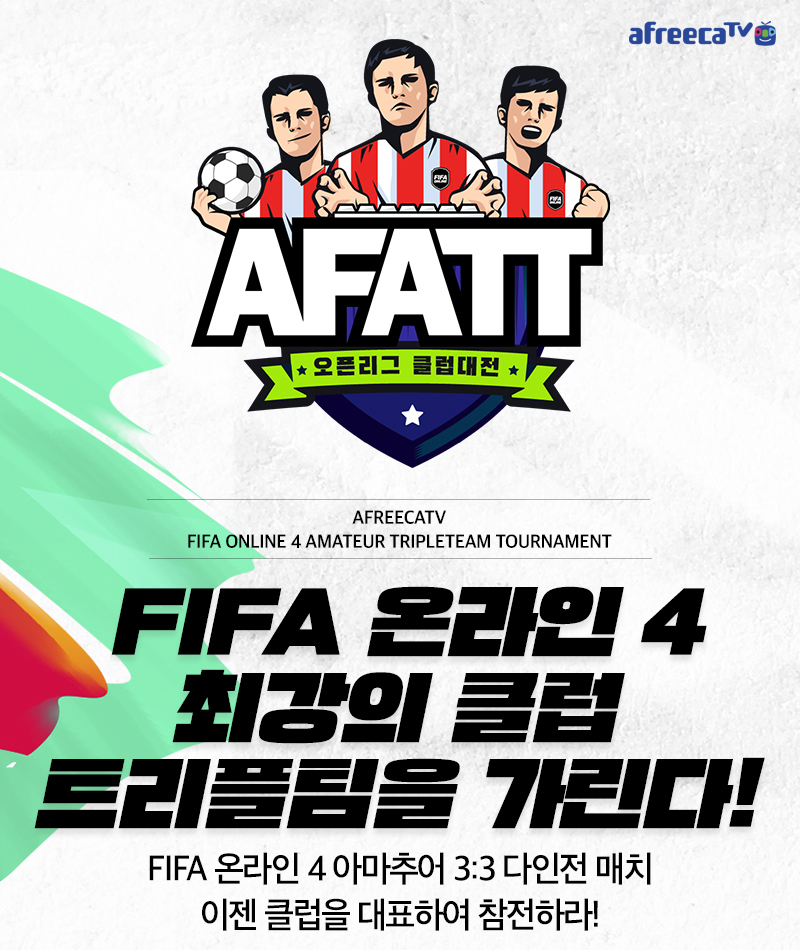 ¾ÆÇÁ¸®Ä«TV´Â EAÄÚ¸®¾Æ ½ºÆ©µð¿À°¡ °³¹ßÇÏ°í ³Ø½¼ÀÌ ¼ºñ½ºÇÏ´Â ¡®EA SPORTS¢â FIFA Online 4(ÀÌÇÏ FIFA ¿Â¶óÀÎ 4)¡¯·Î ÁøÇàµÇ´Â ¾Æ¸¶Ãß¾î ´ëȸ ¡®AfreecaTV FIFA Online 4 Amateur Triple team Tournament(ÀÌÇÏ AFATT) Ŭ·´´ëÀü¡¯ÀÇ Âü°¡ Á¢¼ö¸¦ ¿À´Â 31ÀÏ(¸ñ)ºÎÅÍ ÁøÇàÇÑ´Ù°í ¹àÇû´Ù. AFATT´Â 3vs3 ´ÙÀÎÀü ¸ÅÄ¡·Î ÁøÇàµÇ¸ç, ¿¹¼±°ú º»¼±À» ÅëÇØ FIFA ¿Â¶óÀÎ 4ÀÇ ¾Æ¸¶Ãß¾î ÃÖ°ÆÀÀ» °¡¸®´Â ´ëȸ´Ù.