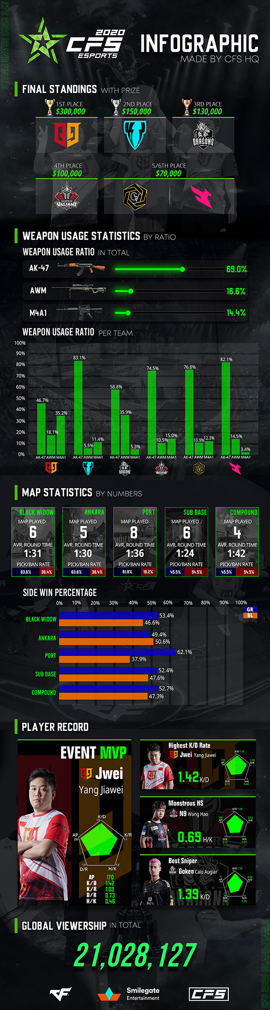 ½º¸¶ÀϰÔÀÌÆ®´Â Äڷγª19 È®»ê¿¡ µû¶ó CFS 2020 ±×·£µå ÆÄÀ̳ÎÀ» ¾ÈÀüÇÏ°Ô °³ÃÖÇϱâ À§ÇØ ±Û·Î¹ú 3°³ Áö¿ª(À¯·´-MENA, ¾Æ¸Þ¸®Ä«, Áß±¹)¿¡¼ ¼±¹ßµÈ 6°³ ÆÀÀ¸·Î Ä¡·¶´Ù. ÀÌ °á°ú Áß±¹ÀÇ ÄªÁö¿ì e½ºÆ÷Ã÷°¡ ¾ð´õµ¶ÀÇ ¹Ý¶õÀ» ÀÏÀ¸Å°¸ç ¿ì½ÂÀ» Â÷ÁöÇØ, 30¸¸ ´Þ·¯(ÇÑÈ ¾à 3¾ï 2700¸¸¿ø)ÀÇ »ó±ÝÀ» Â÷Áö Çß´Ù. ºê¶óÁúÀÇ µÎ ÆÀÀÎ ºó½ÃÆ® °ÔÀְ̹ú ºí·¢ µå·¡°ï½º°¡ °¢°¢ ÁØ¿ì½Â°ú 3À§¸¦ Â÷ÁöÇϸç ĪÁö¿ìÀÇ µÚ¸¦ À̾ú´Ù.