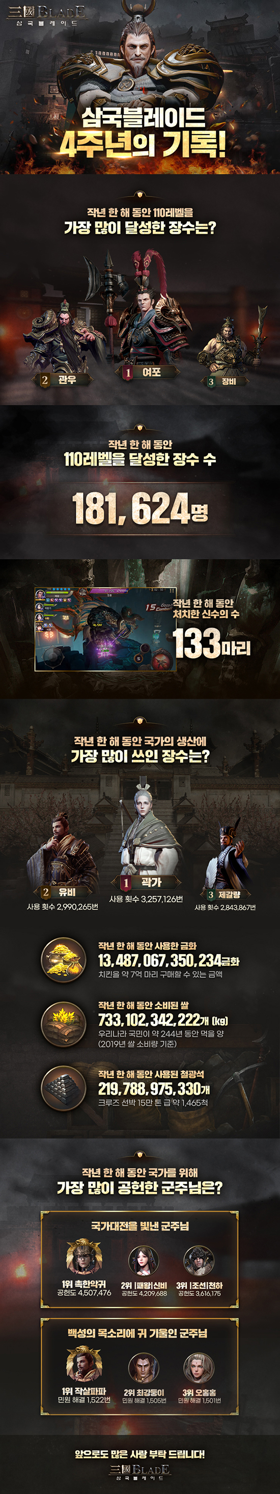 À̹ø ÀÎÆ÷±×·¡ÇÈÀº À¯ÀúµéÀÇ °ü½É°ú È£ÀÀ¿¡ º¸´äÇϱâ À§ÇØ Á¦ÀÛµÆÀ¸¸ç ¡®»ï±¹ºí·¹À̵å 4ÁÖ³âÀÇ ±â·Ï¡¯¶ó´Â ŸÀÌÆ²·Î ÀÛ³â ÇÑÇØ µ¿¾È óġÇÑ ½Å¼öÀÇ ¼ö, °¡Àå ¸¹ÀÌ ¾²ÀÎ Àå¼ö, ¼ÒºñµÈ ±ÝÈ¿Í ½Ò µîÀÌ °ø°³µÆ´Ù.