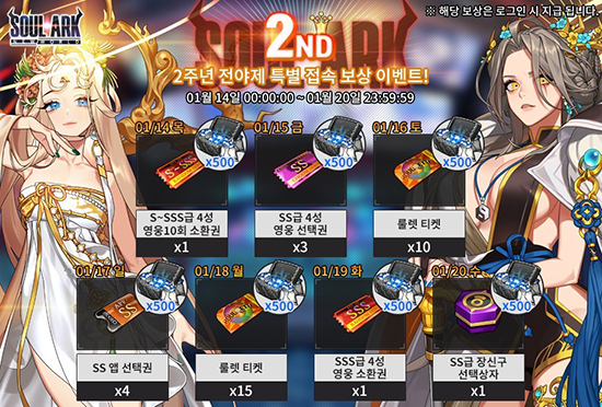 ¶ÇÇÑ, 18ÀÏ¿¡ ·Î±×ÀÎ ½Ã ºí·ç Å©¸®½ºÅ» 500°³¿Í ·ê·¿ ƼÄÏ 15°³, 19ÀÏ ºí·ç Å©¸®½ºÅ» 500°³, SSS±Þ 4¼º ¿µ¿õ ¼Òȯ±Ç 1°³, 20ÀÏ ºí·ç Å©¸®½ºÅ» 500°³¿Í SS±Þ Àå½Å±¸ ¼±ÅûóÀÚ 1°³¸¦ Á¦°øÇÑ´Ù.