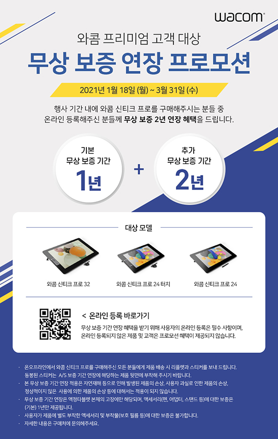 ¿ÍÄÞ(Wacom)ÀÇ Çѱ¹¹ýÀÎ Çѱ¹¿ÍÄÞÀÌ ¿ÍÄÞ ½ÅƼũÇÁ·Î32, ¿ÍÄÞ ½ÅƼũÇÁ·Î24, ½ÅƼũÇÁ·Î24 ÅÍÄ¡ µî ÇÁ¸®¹Ì¾ö ¾×Á¤Å¸ºí·¿ ¸ðµ¨ 3Á¾À» ±¸¸ÅÇÏ´Â °í°´¿¡°Ô ¹«»ó º¸Áõ ±â°£À» Ãß°¡·Î 2³â ´õ ¿¬ÀåÇØ ÁÖ´Â ÇÁ·Î¸ð¼ÇÀ» ±ÝÀϺÎÅÍ ¿À´Â 3¿ù 31ÀÏ(¼ö)±îÁö ÁøÇàÇÑ´Ù°í ¹àÇû´Ù.