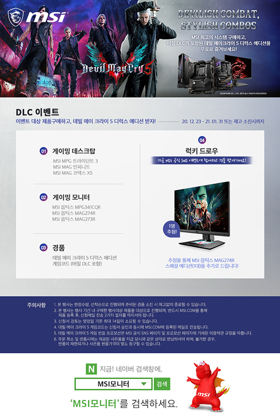 À̸¦ ±â³äÇϱâ À§ÇØ, 2020³â 1¿ù 31ÀϱîÁö Çà»ç ´ë»ó MSI °ÔÀÌ¹Ö ¸ð´ÏÅÍ ¹× °ÔÀÌ¹Ö PC¸¦ ±¸¸ÅÇϰí, ÇÁ·Î¸ð¼Ç¿¡ Âü¿©ÇÏ´Â ±¸¸Å °í°´¿¡°Ô ¡®µ¥ºô ¸ÞÀÌ Å©¶óÀÌ 5 µð·°½º ¿¡µð¼Ç¡¯ °ÔÀÓ Äڵ带 Á¦°øÇÑ´Ù. ƯÈ÷, ÀÌ ÄÚµå´Â ½Å±Ô ij¸¯ÅÍ ¡®¹öÁú¡¯À» Ç÷¹ÀÌ ÇÒ ¼ö ÀÖ´Â DLC±îÁö ¸ðµÎ Æ÷ÇÔ, ¾à 64,000¿ø »ó´çÀÇ °¡Ä¡¸¦ °®´Â´Ù.