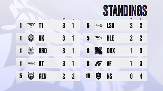 4ÀÏÂ÷ °æ±â±îÁö Ä¡¸¥ LCK CLÀº µ¶º¸ÀûÀÎ °ÆÀ ¾øÀÌ Ä¡¿ÇÑ °ø¹æ ÁßÀÌ´Ù. Áö³ ÁÖ ¹«ÆÐ ±â·ÏÀÌ ±úÁö¸ç, T1, DWG KIA, ÇÁ·¹µ÷ ºê¸®¿Â, kt ·Ñ½ºÅͰ¡ ¸ðµÎ 3½Â 1ÆÐ·Î °øµ¿ 1À§¿¡ ¿Ã¶óÀÖ´Ù. ±× µÚ´Â Á¨Áöe½ºÆ÷Ã÷¿Í ¸®ºê »÷µå¹Ú½º, ÇÑÈ»ý¸íe½ºÆ÷Ã÷°¡ 2½Â 2ÆÐ¸¦ ±â·ÏÇÏ¸ç ¹Ù¦ ÂѰí ÀÖ´Ù.