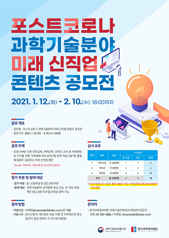 °úÇбâ¼úÁ¤º¸Åë½ÅºÎ¿Í Çѱ¹°úÇÐâÀÇÀç´ÜÀº Àü ±¹¹ÎÀ» ´ë»óÀ¸·Î ¡®Æ÷½ºÆ®Äڷγª °úÇбâ¼úºÐ¾ß ¹Ì·¡ ½ÅÁ÷¾÷ ÄÜÅÙÃ÷ °ø¸ðÀü¡¯À» ÁøÇàÇÑ´Ù.