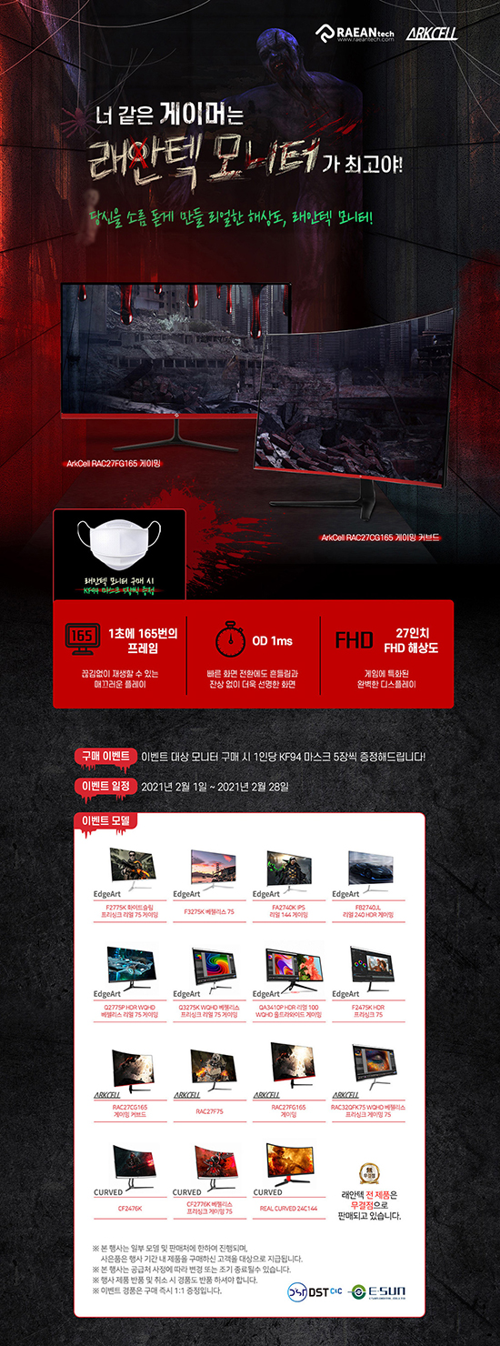 2021³â 2¿ù 1ÀϺÎÅÍ 2¿ù 28ÀϱîÁö À̺¥Æ® ¾È³»°¡ ¹Ý¿µµÈ ÆÇ¸Å »çÀÌÆ®¸¦ ÅëÇØ ´ë»ó ¸ð´ÏÅÍ ±¸¸Å ½Ã Âü¿©°¡ ¿Ï·áµÇ¸ç, ±¸¸ÅÀÚ Àü¿ø¿¡°Ô´Â 1Àδç KF94 ÀÎÁõ ¸¶½ºÅ© 5ÀåÀÌ 1:1 ÁõÁ¤µÈ´Ù.