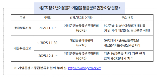 ¶ÇÇÑ µî±ÞºÐ·ù ¾÷¹«´Â 2025³â 11¿ù 1ÀϺÎÅÍ, ³»¿ë¼öÁ¤½Å°í ¾÷¹«´Â 12¿ù 1ÀϺÎÅÍ À§Å¹ÀÌ ½ÃÇàµÈ´Ù. ÀÌ¿¡ µû¶ó û¼Ò³âÀÌ¿ëºÒ°¡ PC, ÄÜ¼Ö °ÔÀÓ¹°ÀÇ µî±ÞºÐ·ù ½ÅûÀº 10¿ù 31ÀϱîÁö °ÔÀÓÀ§¿¡ Á¢¼öµÈ °Ç¿¡ ÇÑÇÏ¿© °ÔÀÓÀ§°¡ ó¸®Çϸç, 11¿ù 1ÀϺÎÅÍ ½ÅûµÈ °Ç¿¡ ´ëÇØ¼´Â GCRB°¡ ´ã´çÇÏ°Ô µÈ´Ù.