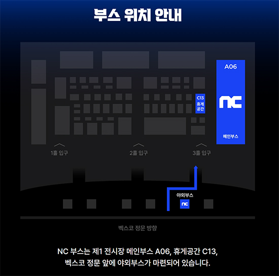 ¸ÞÀÎ ºÎ½º´Â º¤½ºÄÚ Á¦1 Àü½ÃÀå ¸ÞÀκνº A06¿¡ À§Ä¡Çß´Ù. 3Ȧ ÀÔ±¸ ¹Ù·Î ¿À¸¥ÆíÀÌ´Ù. ¸ÞÀÎ ºÎ½º ¾Õ¿¡´Â ÈÞ°Ô°ø°£ C13ÀÌ ÁغñµÆ°í, ¾ß¿Ü¿¡µµ ºÎ½º°¡ ÁغñµÅ ÀÖ´Ù. ¾ß¿Ü ºÎ½º¿¡¼´Â ¡®NC X ´Ù¸£´Ù Çɺ¼ °ÔÀÓ¡¯, ¡®NC Æ÷ÅäÁ¸¡¯ µî À̺¥Æ®·Î °ü¶÷°´À» ¸Â´Â´Ù.