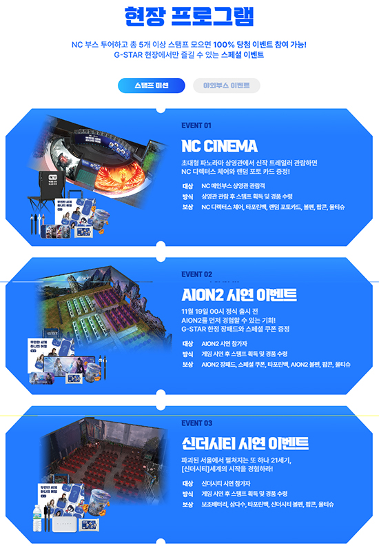 µ¼ »ó¿µ°üÀº ¡®¿£¾¾ ½Ã³×¸¶(NC CINEMA)¡¯¶ó´Â À̸§ÀÌ ºÙ¾ú´Ù. ÃÊ´ëÇü ÆÄ³ë¶ó¸¶ »ó¿µ°üÀ» ÅëÇØ ÃâǰÀÛ Æ®·¹ÀÏ·¯¸¦ °ü¶÷°´ÀÌ º¼ ¼ö ÀÖµµ·Ï ±¸¼ºÇß´Ù. Æ®·¹ÀÏ·¯¸¦ °ü¶÷ÇÑ ¹æ¹®°´¿¡°Ô´Â NC µð·ºÅͽº ü¾î, ŸÆ÷¸°¹é, ·£´ý Æ÷ÅäÄ«µå, º¼Ææ, ÆËÄÜ, ¹°Æ¼½´ µîÀ» º¸»óÀ¸·Î ÁØ´Ù.