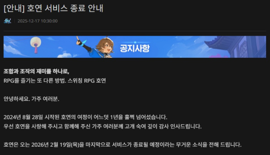 ¿£¾¾¼ÒÇÁÆ®°¡ °³¹ßÇÏ°í ¼ºñ½ºÇÏ´Â MMORPG 'È£¿¬'ÀÌ 2026³â 2¿ù 19ÀÏ ¼ºñ½º Á¾·á¸¦ ¿¹°íÇß´Ù. 2024³â 8¿ù 28ÀÏ ¼ºñ½º¸¦ ½ÃÀÛÇÑ µÚ 477¸¸¿¡ ¹ßÇ¥µÈ ¼ºñ½º Á¾·á ¿¹°í·Î, ¹ßÇ¥´ë·Î ¼ºñ½º°¡ Á¾·áµÉ °æ¿ì ÃÑ 541ÀÏ ¼ºñ½ºÇÏ°Ô µÈ´Ù.