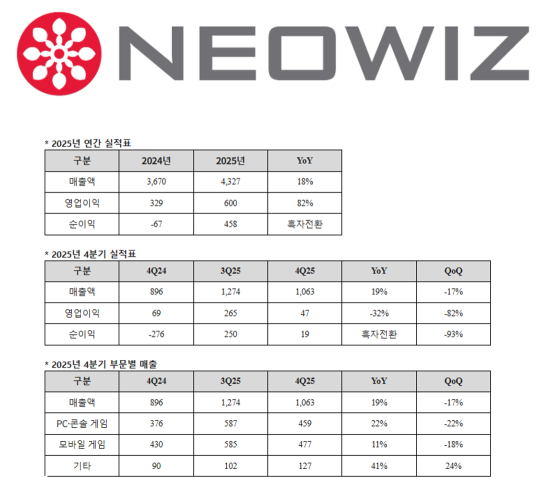 2025³â 4ºÐ±â ¸ÅÃâ¾×Àº 1,063¾ï ¿ø, ¿µ¾÷ÀÌÀÍÀº 47¾ï ¿øÀ» ±â·ÏÇß´Ù. ¸ÅÃâ¾×Àº Àü³â µ¿±â ´ëºñ 19% Áõ°¡, Àü ºÐ±â ´ëºñ 17% °¨¼ÒÇß´Ù. ¿µ¾÷ÀÌÀÍÀº Àü³â µ¿±â ´ëºñ 32%, Àü ºÐ±â ´ëºñ 82% ÁÙ¾ú°í, ´ç±â¼øÀÌÀÍÀº 19¾ï ¿øÀ¸·Î Àü³â µ¿±â ´ëºñ ÈæÀÚÀüȯ, Àü ºÐ±â ´ëºñ 93% Ãà¼ÒµÆ´Ù.