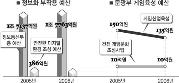 Á¤º¸Åë½ÅºÎ°¡ 2006³â °ÔÀÓ ¿µ»ó ¸ð¹ÙÀÏ »ê¾÷ µî µðÁöÅÐ ÄÜÅÙÃ÷»ê¾÷ À°¼º¿¡ Æí¼ºÇÑ 1³â ¿¹»êÀº 1309¾ï ¿ø. ±×·¯³ª ÀÎÅÍ³Ý Áßµ¶°ú °ÔÀÓ Áßµ¶ »çÅ °³¼±¿¡ µû¶ó Æí¼ºµÈ ¿¹»êÀº 9¾ï¿© ¿ø Á¤µµ¿¡ ºÒ°úÇϸç, ¹®È°ü±¤ºÎµµ ÃÖ±Ù °ÔÀÓ »ê¾÷ ÁõÁø¿¡ 135¾ï ¿øÀ» ¾²°Ú´Ù°í ¹àÇûÁö¸¸ °ÇÀü °ÔÀÓ¹®È Á¶¼º ¿¹»êÀº 10¾ï ¿ø Á¤µµ·Î ½ÃÀå ±Ô¸ð¿¡ Àý´ëÀûÀ¸·Î ¸ÂÁö ¾Ê´Â ¼öÄ¡´Ù.