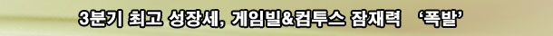 °ÔÀÓºôÀº °ÔÀÓºôÀº 2011³â 3ºÐ±â ¿¬°á ½ÇÀûÀ¸·Î ¸ÅÃâ 100¾ï ¿ø, ¿µ¾÷ÀÌÀÍ 45¾ï ¿ø, ´ç±â¼øÀÌÀÍ 40¾ï ¿øÀ» ±â·ÏÇß´Ù. ÀÌ´Â Àü³âµ¿±â´ëºñ ¸ÅÃâ 40%, ¿µ¾÷ÀÌÀÍ 30%, ´ç±â¼øÀÌÀÍ 26% ¿À¸¥ ¼öÄ¡´Ù. ¶Ç, ÄÄÅõ½º´Â ¿Ã 3ºÐ±â ¿¬°á±âÁØ ¸ÅÃâÀÌ 91¾ï ¿ø, ¿µ¾÷ÀÌÀÍÀÌ 10¾ï ¿ø, ´ç±â¼øÀÌÀÍÀÌ 13¾ï ¿øÀ¸·Î Àü³âµ¿±â´ëºñ ¸ÅÃâÀÌ 22.7%, ¿µ¾÷ÀÌÀÍÀÌ 60.3%, ´ç±â¼øÀÌÀÍÀÌ 44.8% Áõ°¡ÇÑ ¼öÄ¡´Ù.