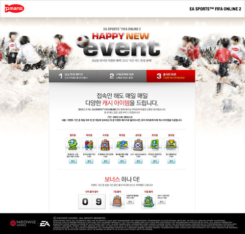 ³×¿ÀÀ§Áî°ÔÀÓÁî´Â Áß¿ä ŸÀÌÆ²ÀÎ ¡®ÇÇÆÄ¿Â¶óÀÎ2¡¯´Â 2¿ù 2ÀϱîÁö ¸ÅÀÏ ÇÏ·ç Çѹø °ÔÀÓ¿¡ Á¢¼ÓÇÑ ÈÄ À̺¥Æ® ÆäÀÌÁö¿¡ ¹æ¹®Çϸé, ¡®2011 ´ëÇѹα¹ ´ëǥīµå¡¯¿Í ¡®ÀÌÀû¼±¼ö È®ÀåÄ«µå¡¯ µî ¿äÀϸ¶´Ù ´Ù¸¥ ij½Ã ¾ÆÀÌÅÛÀ» ȹµæÇÒ ¼ö ÀÖ´Ù. 7ÀÏ ¶Ç´Â 10Àϵ¿¾È Ãâ¼®ÇÑ ÀÌ¿ëÀڵ鿡°Ô´Â ¡®¿À·»Áö»ö ¹°À½Ç¥ Ä«µå¡¯¿Í ¡®2011 ½ÃÁðÄ«µå¡¯¸¦ Ãß°¡ ÁõÁ¤ÇÑ´Ù.