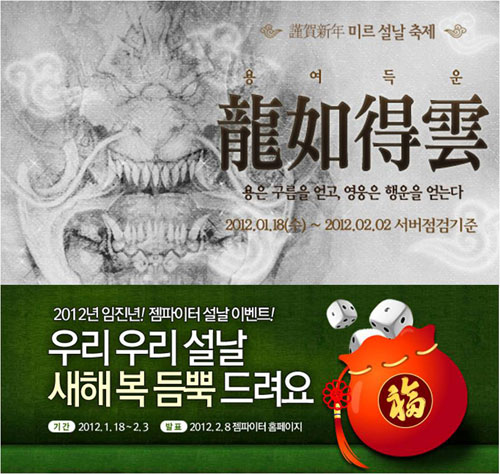 ¸ÕÀú ¡®¸ÞÀÌÇýºÅ丮¡¯¿¡¼´Â ¿À´Â 2¿ù 1ÀϱîÁö ¸ÅÀÏ Æ¯Á¤½Ã°£¿¡ °ÔÀÓ ³» °æÇèÄ¡ µÎ ¹è ÇýÅÃÀ» Á¦°øÇÑ´Ù. ¾Æ¿ï·¯ 21ÀϺÎÅÍ 2ÁÖ°£ ÁÖ¸»(Åä, ÀÏ) ¿ÀÈÄ 2½Ã 30ºÐºÎÅÍ 1ºÐ°£ Á¢¼ÓÇÑ ¸ðµç À¯Àú¿¡°Ô ¡®Èæ·æÀÇ °ßÀ塯, ¡®±àÁ¤ÀÇ È¥µ· ÁÖ¹®¼¡¯ µî °í±Þ¾ÆÀÌÅÛÀ» Áö±ÞÇÏ´Â ¡®ÇÖ Å¸ÀÓ¡¯ À̺¥Æ®µµ ÁøÇàÇÑ´Ù. À̹ۿ¡ ¸ó½ºÅÍ »ç³ÉÀ» ÅëÇØ ¸ðÀ» ¼ö ÀÖ´Â À½½Ä Àç·áµé·Î ¡®¶±±¹¡¯ ¾ÆÀÌÅÛÀ» ¸¸µé¸é Ưº°ÇÑ º¸»ó ÇýÅÃÀ» Á¦°øÇÏ´Â ¡®¸ÀÀÖ´Â ¶±±¹ ¸¸µé±â¡¯¸¦ ºñ·ÔÇØ, ¡®Áñ°Å¿î ¸ÞÀÌÇà À·³îÀÌ¡¯, ¡®Èæ·æ ÅðÄ¡Çϰí Èæ·æÀÇ ±â¿îÀ»!¡¯, ¡®Ç³¼ºÇÑ ¼³³¯ ¼Ò¿øÀ» ¸»ÇغÁ!¡¯ µî ´Ù¾çÇϰí Âü½ÅÇÑ À̺¥Æ®µéµµ ÇÔ²² ÁøÇàÇÑ´Ù. ¿À´Â 2¿ù 2ÀϱîÁö ¾à 2ÁÖ°£ ¡®´øÀü¾ØÆÄÀÌÅÍ¡¯ÀÇ '¿ëÀÇ Ãູ' À̺¥Æ®¸¦ ÅëÇØ À¯ÀúµéÀº ´øÀü¿¡¼ ȹµæ °¡´ÉÇÑ '¿ëÀÇ ºñ´Ã'À» ¸ð¾Æ ¡®Çîµ·¸¶ÀÌ¾î ±¤À塯¿¡ À§Ä¡ÇÑ ¿ë ¼®»óÀ» Àå½ÄÇÒ ¼ö ÀÖ´Ù. ¼¹ö º°·Î ÁöÁ¤µÈ ¡®¿ëÀÇ ºñ´Ã¡¯ ¸ñǥġ¸¦ ´Þ¼ºÇÑ ¼®»óÀº ÇÏ·ç ÃÖ´ë 1ȸ¿¡ ÇÑÇØ Àü½ÅÀÌ ±Ý»öÀ¸·Î º¯Çϰí, ¡®ºê·¹½º(Breath¡¯¸¦ »ÕÀ¸¸ç À¯Àúµé¿¡°Ô 60ºÐ °£ ´øÀü °æÇèÄ¡ 3¹è, ¾ÆÀÌÅÛ È¹µæ·ü 2¹è, °È ¼º°øÈ®·ü Áõ°¡ µîÀÇ ÆÄ°ÝÀûÀÎ ÇýÅÃÀ» Á¦°øÇÑ´Ù. ¶ÇÇÑ 21ÀϺÎÅÍ 24ÀϱîÁö´Â 'Ȳ±Ý°íºí¸°' À̺¥Æ®¸¦ ÅëÇØ ´Ù¾çÇÑ °ÔÀÓ ¾ÆÀÌÅÛ°ú °ñµå¸¦ ¾òÀ» ¼ö ÀÖ´Ù. ¡®¼µç¾îÅá¯Àº ¿À´Â 21ÀϺÎÅÍ 24ÀϱîÁö Ưº° À̺¥Æ®¸¦ ½Ç½ÃÇÑ´Ù. ÇØ´ç±â°£ µ¿¾È ¿ÀÈÄ 2½ÃºÎÅÍ 5½Ã±îÁö ¼¼ ½Ã°£ µ¿¾È °ÔÀÓÀ» Áñ±ä À¯ÀúµéÀº 2¹èÀÇ °æÇèÄ¡ ÇýÅÃÀ» ´©¸± ¼ö ÀÖÀ¸¸ç, ƯÈ÷ 21ÀÏ ¿ÀÈÄ 3½Ã¿¡ Á¢¼ÓÇÑ ¸ðµç À¯Àú´Â ÃÖ´ë 10¸¸ °æÇèÄ¡¿Í ÇÔ²² Àϰè±Þ ƯÁøÀÇ ÇýÅÃÀ» ¹ÞÀ» ¼ö ÀÖ´Ù. ¶Ç 26ÀϱîÁö ÀÏÁÖÀÏ °£ PC¹æ¿¡¼ °ÔÀÓÀ» Áñ±â´Â À¯Àúµé¿¡°Ô´Â '°ñµå±ÇÃÑ ½ºÆä¼È»óÀÚ', '´Ð³×ÀÓ Ä÷¯º¯°æ', 'Áï½Ã ¸®½ºÆù' µî ´Ù¾çÇÑ °ÔÀÓ ¾ÆÀÌÅÛÀ» Á¦°øÇÑ´Ù. ¸¶ºñ³ë±â ¿µ¿õÀü¿¡¼´Â Èæ·æÀÇ ÇØ¸¦ ¸Â¾Æ ÀÚ½ÅÀÇ Ä³¸¯Å͸¦ ²Ù¹Ð ¼ö ÀÖ´Â ¡®Èæ·æ ÆäÀ̽º/¹ÙµðÆäÀÎÆÃ ±³È¯±Ç¡¯À» ¹«·á·Î Á¦°øÇϰí, °ÔÀÓ ³» NPC¸¦ ÅëÇØ ¾òÀ» ¼ö ÀÖ´Â À̺¥Æ® ¼ýÀÚ ÄíÆùÀ» ¸ð¾Æ ¡®2012¡¯¸¦ ¿Ï¼ºÇÑ À¯Àú¿¡°Ô ´Ù¾çÇÑ °ÔÀÓ ¾ÆÀÌÅÛÀ» Á¦°øÇÑ´Ù.