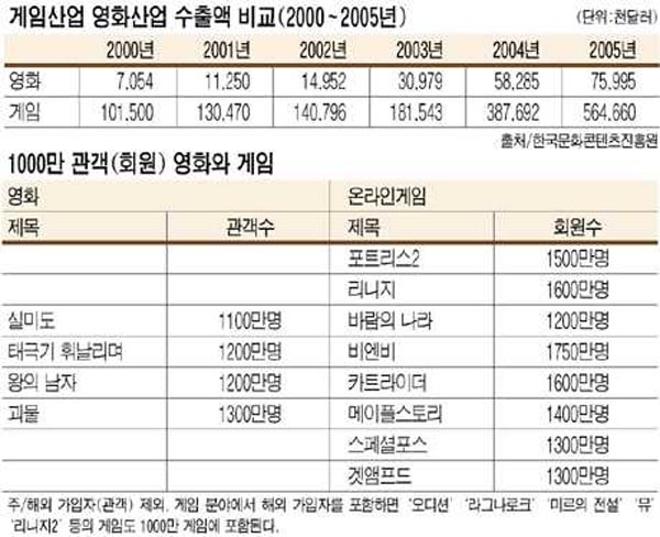 ¿µÈ°è°¡ ÃÖ±Ù 2~3³â »çÀÌ `½Ç¹Ìµµ` `űرâ ÈÖ³¯¸®¸ç, `¿ÕÀdz²ÀÚ' `±«¹°' µî 1000¸¸ °ü°´ ¿µÈ¸¦ ½ñ¾Æ³»¸ç ½Â½ÂÀ屸Çϰí ÀÖ´ÙÁö¸¸, ¿Â¶óÀΰÔÀÓ ¾÷°è´Â ÀÌ¹Ì 2000³âµµºÎÅÍ 1000¸¸ °¡ÀÔÀÚ ½Ã´ë¸¦ ¿¾ú´Ù. Áö±Ý²¯ ´©Àû °¡ÀÔÀÚ 1000¸¸ ¸íÀ» µ¹ÆÄÇÑ °ÔÀÓ¸¸ `Æ÷Æ®¸®½º2', `¸®´ÏÁö', `¹Ù¶÷ÀÇ ³ª¶ó', `°Ù¾ÚÇÁµå', `½ºÆä¼ÈÆ÷½º', `ºñ¿£ºñ', `īƮ¶óÀÌ´õ', `¸ÞÀÌÇà ½ºÅ丮' µî 10Á¾¿¡ ´ÞÇÑ °ÍÀ¸·Î Áý°èµÇ°í ÀÖ´Ù.