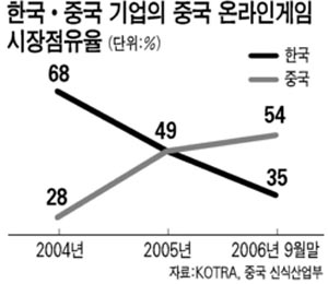 ÇѶ§ Áß±¹ ½ÃÀåÀ» Àå¾ÇÇß´ø Çѱ¹ ¿Â¶óÀΰÔÀÓÀÌ Áß±¹°ú ¼±¸ °ÔÀÓÀÇ ¾àÁøÀ¸·Î ºñƲ°Å¸®°í ÀÖ´Ù. Áß±¹ °ÔÀÓ½ÃÀåÀÇ ¼ºÀå°ú ÀÚ±¹ÀÇ °ÔÀÓµéÀÇ Ä÷¸®Æ¼°¡ ³ª³¯ÀÌ ³ô¾ÆÁü¿¡ µû¶ó ±¹³» °ÔÀÓµéÀÇ ½ÃÀåÁ¡À¯À²ÀÌ ³·¾ÆÁö°í ÀÖ´Â °ÍÀÌ´Ù. Áß±¹ÀÇ »ó½Â¼¼¿Í Çѱ¹ÀÇ Ç϶ô¼¼°¡ ¶Ñ·ÇÇØ ÇöÁö¹ýÀÎ °ü°èÀÚ µî¿¡ µû¸£¸é Çѱ¹ ¿Â¶óÀΰÔÀÓÀº Áö³ 2002³â '¹Ì¸£ÀÇ Àü¼³' ½Ã¸®Áî°¡ µ¿½ÃÁ¢¼ÓÀÚ 60¸¸¸íÀ» µ¹ÆÄÇÏ´Â µî Å« ¼º°øÀ» °ÅµÎ¸é¼ 2003³â ½ÃÀåÁ¡À¯À²ÀÌ 52%±îÁö ¿Ã¶ó°¬´Ù.