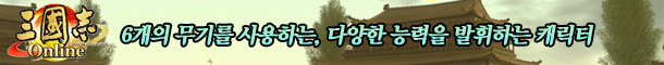 ÀÌ·¸°Ô °ÔÀÓÀÇ Áß¿äÇÑ ÇϳªÀÇ Æ²À» Â÷ÁöÇϰí ÀÖ´Â »ï±¹Áö ¿Â¶óÀÎÀÇ ¹«±â´Â 6°¡Áö·Î ³ª´©¾îÁ® ÀÖ´Ù. À̵µ·ù¶ó°í ÇÒ ¼ö ÀÖ´Â ¡®¾ç¼Õ¹«±â¡¯¸¦ ÀåºñÇÑ Ä³¸¯ÅÍ´Â °ø°Ý·ÂÀÌ Å©°Ô ´Ã¾î³ª¸ç, Àû¿¡°Ô ¸¹Àº ´ë¹ÌÁö¸¦ ÁÙ ¼ö ÀÖ´Â ½ºÅ³À» ȹµæÇÒ ¼ö ÀÖ´Ù. ¿À¸¥¼Õ¿¡´Â ÇÑ¼Õ ¹«±â, ¿Þ¼Õ¿¡´Â ¹æÆÐ¸¦ ÀåÂøÇÑ ¡®ÇѼչ«±â¡¯´Â ¹æ¾î·ÂÀÌ ³ô¾Æ¼ ¾Æ±ºÀÇ ¹æ¾î·Âµµ ÀüüÀûÀ¸·Î ¿Ã¸± ¼ö ÀÖ´Â ¿ªÇÒÀ» Çϸç, âÀ̳ª ¸ð µîÀÇ ¡®¾ç¼Õ⹫±â¡¯°è¿Àº ÀûÀÇ ¹æ¾î·ÂÀ» Ç϶ô½Ã۰í ÀûµéÀ» ¸¶ºñ½ÃŰ´Â µîÀÇ Æ¯¼öÇÑ ½ºÅ³µéÀ» ¹è¿ï ¼ö ÀÖ´Ù. ÁöÆÎÀÌ µîÀÇ ¡®·Ã´Ü°è¹«±â¡¯¸¦ ÀåºñÇÑ Ä³¸¯Åʹ ȸº¹°è ½ºÅ³À» ¹è¿ï ¼ö ÀÖÀ¸¸ç, ºÎ䳪 ¸ñ°ËÀ» µç ¡®¿ä¼ú°è¹«±â¡¯´Â ¿ä¼ú·Î½á Àûµé¿¡°Ô ´ë¹ÌÁö¸¦ ÁÙ ¼ö ÀÖ°í, ȰÀ̳ª ³ë µî ¡®Åõ»ç°è¹«±â¡¯´Â ¿ø°Å¸®°ø°ÝÀ¸·Î½á ÈûÀ» ¹ßÈÖÇÑ´Ù.