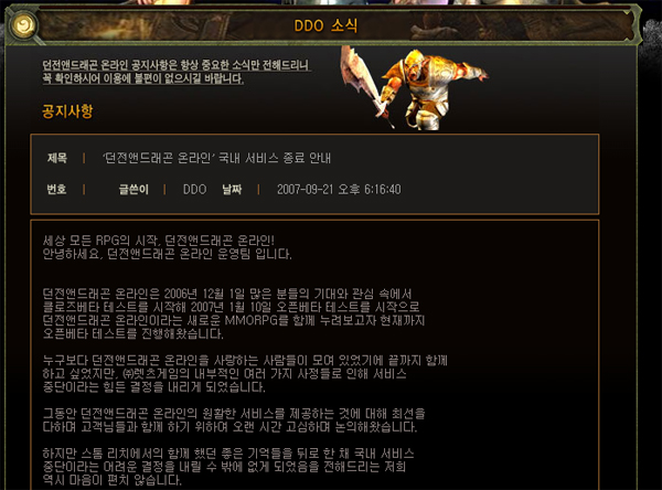 ´øÀü¾Øµå·¡°ïÀ» ¿î¿µÇÏ´Â ·¿Ã÷°ÔÀÓÀº ÃÖ±Ù Çѱ¹¾î °ø½Ä ȨÆäÀÌÁö(ddo-korea.com)¸¦ ÅëÇØ "°ÔÀÓ¿¡ ´ëÇÑ ¼ºñ½º¿Í °í°´¼¾ÅÍ ¿î¿µÀ» ¿À´Â 30ÀÏ 18½Ã±îÁö·Î ¸¶°¨ÇÑ´Ù"°í ÀÔÀåÀ» ¹àÇû´Ù. ±¹³» ¼ºñ½º °³½Ã 10°³¿ù ¸¸¿¡ ½ÃÀå ö¼ö¸¦ ¼±¾ðÇÑ °Í. ÀÌ·Î½á ±¹³»¿¡¼ ¾î¶² °ÔÀÓº¸´Ù ¸¹Àº ÁÖ¸ñÀ» ¹Þ¾Ò´ø °ÔÀÓÀÌ 2007³â 9¿ùÀ» ¸¶Áö¸·À¸·Î ¡®¿Â¶óÀÎ °ÔÀÓ ¿Õ±¹¡¯¿¡¼ ÀÚÃ븦 °¨Ãß°Ô µÇ¾ú´Ù.