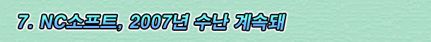 ±×¸®°í ÇØ°¡ ¹Ù²ï 2007³â¿¡µµ NC¼ÒÇÁÆ®ÀÇ °í³Àº ¸ØÃâ ±â¹Ì¸¦ º¸ÀÌÁö ¾Ê¾Ò´Ù. 2007³â 4¿ù ¸®´ÏÁöÀÇ ÃÖ½ÅÀÛÀÎ ¸®´ÏÁö3ÀÇ ÀüÀÓ °³¹ßÆÀÀåÀ̾ú´ø ¹Ú¸ð ½ÇÀåÀÌ ¸®´ÏÁö3ÀÇ ±â¼úÀ¯ÃâÀ» Çß´Ù´Â ÇøÀǸ¦ ¹Þ¾Ò°í, ¸®´ÏÁö3´Â ¹Ú¸ð ½ÇÀå ÈÖÇÏÀÇ °³¹ßÆÀ¿øµé°ú ºÒȸ¦ °ÞÀ¸¸ç 1³â ¿© µ¿¾È °è¼ÓÇØ ¿Ô´ø °³¹ßÀ» Áß´ÜÇÏ´Â ÀÏÀÌ ¹ú¾îÁø °Í. ¼³»ó°¡»óÀ¸·Î 2005³â~2006³â 2³â°£ °ÉÃÄ ±¹³»¼ ¹úÀÎ »õ·Î¿î ÇÁ·ÎÁ§Æ®µéÀÌ ¸ðµÎ ºÎÁøÀ» ¸éÄ¡ ¸øÇß´Ù. ƯÈ÷ 2007³â ¼¼°è ´ÙÁ߿¶óÀΰÔÀÓ ½ÃÀåÁ¡À¯À²ÀÇ 45%¸¦ Â÷ÁöÇÏ´ø ¸®´ÏÁö ½Ã¸®Áî°¡ ºí¸®ÀÚµåÀÇ WOW¿¡ ¿ÕÁ¸¦ ³»ÁÖ¾ú´Ù´Â »ç½ÇÀº NCÀÇ ½Ã¸§À» ´õ¿í ±í°Ô Çß´Ù.