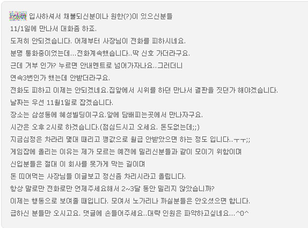 ¶ÇÇÑ ±×´Â ¡°È¸»ç¿¡°Ô ¿ù±Þ ÁöºÒ¿¡ ´ëÇØ Ç×ÀÇÇÏÀÚ ºÎÀå¿¡°Ô µ¹¾Æ¿À´Â ´äº¯Àº ³ëµ¿ºÎ¿¡ ½Å°í¸¦ Ç϶ó´Â ¾ê±â»ÓÀ̾ú´Ù. ¿ù±Þ ÁöºÒÀ» ÇØÁÖ´Â °Í º¸´Ù ¹ú±ÝÀ» ³»´Â °ÍÀÌ ´õ ½Î±â ¶§¹®ÀÌ´Ù¡±¶ó°í ¹àÇû´Ù. Ãæ°ÝÀûÀÎ °ÍÀº ÀÌ N¸ð»ç¿Í µû·Î ºÐ¸®µÇ¾î ¸¸µé¾î Áø K¸ð»ç¿¡¼ ÀÏÀ» ÇÏ°íµµ ¿ù±ÞÀ» Á¦´ë·Î ¹ÞÁö ¸øÇÑ °³¹ßÀÚµéÀÌ »ó´çÈ÷ ¸¹´Ù´Â °Í. ÇØ´ç °Ô½ÃÆÇ¿¡¼ µÎ ȸ»ç¿¡¼ ÇÇÇØ¸¦ ¹Þ¾Ò´Ù¸ç ÇÇÇØ¸¦ È£¼ÒÇÏ´Â °³¹ßÀÚµéÀº »ó´çÇÑ ¼ö¿¡ À̸£´Â °ÍÀ¸·Î ÆÄ¾ÇµÇ°í ÀÖ´Ù.