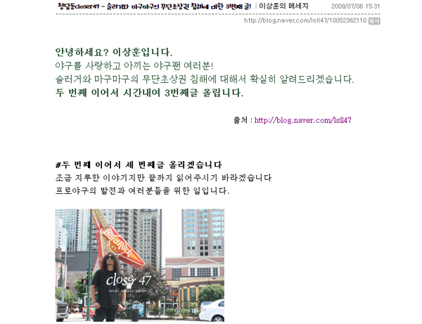ƯÈ÷ ¿Â¶óÀÎ ¾ß±¸ °ÔÀÓ¿¡ ´ëÇÑ ÀºÅð ¼±¼öµéÀÇ ÃÊ»ó±Ç ¹®Á¦¸¦ º»°ÝÀûÀ¸·Î Á¦±âÇÑ Àü LGÆ®À©½º Åõ¼ö ÀÌ»óÈÆ(38)¾¾´Â ÃÖ±Ù Àá½Ç±¸Àå ¾Õ ºÐ¼ö´ë ±¤Àå¿¡¼ ÀÚ½ÅÀÌ º¸Ä÷ΠȰµ¿ ÁßÀÎ ¹êµå '¿Ó'°ú ÇÔ²² °ø¿¬À» °âÇÑ ¼¸í¿îµ¿À» ¹úÀÌ¸ç °ÔÀÓ¾÷üµéÀÇ ºñ¾ç½ÉÀûÀÎ ÇàÀ§¿¡ ´ëÇØ ¾´¼Ò¸®¸¦ ´øÁ³´Ù. ÀÌ¿¡ ¾Õ¼ ÀÌ»óÈÆ¾¾´Â ÀÚ½ÅÀÇ ºí·Î±×¿¡ ¸¶±¸¸¶±¸ÀÇ ¹«´Ü ÃÊ»ó±Ç Ä§ÇØ¿¡ ´ëÇØ Á½ÃÇÏÁö ¾Ê°Ú´Ù¸ç ¼±ÀüÆ÷°í¸¦ ÇÑ ¹Ù ÀÖ´Ù.